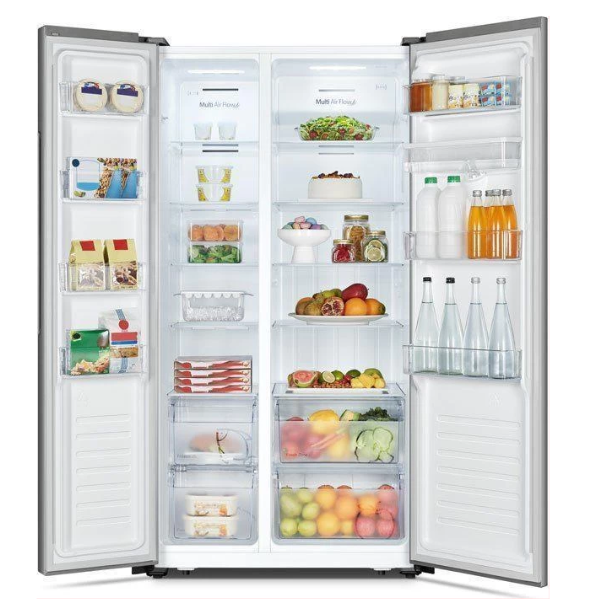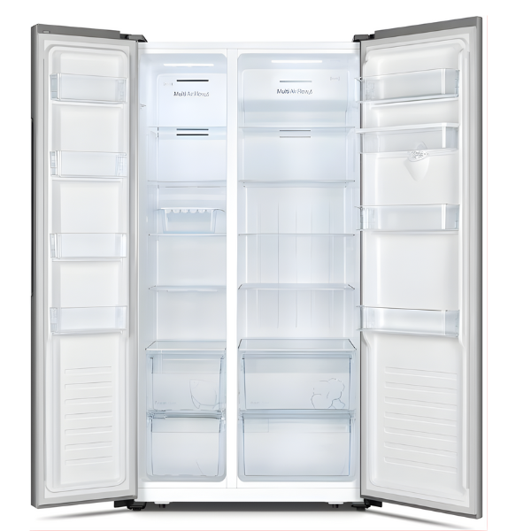 The Hisense RC-750 Side-by-Side Refrigerator is a premium appliance designed for large households and modern kitchens. With a 750-liter gross capacity, this fridge offers expansive storage for fresh and frozen foods. Its side-by-side design combines elegance with functionality, making it ideal for families and frequent entertainers.