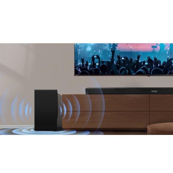 The included wireless subwoofer features a 6.5-inch driver that delivers powerful, distortion-free bass. It connects automatically to the sound bar, allowing flexible placement and eliminating cable clutter. Whether you're watching an explosive action scene or listening to bass-heavy music, the subwoofer adds depth and impact.