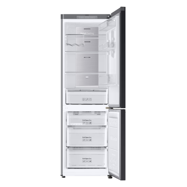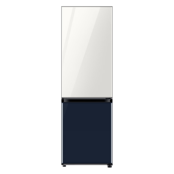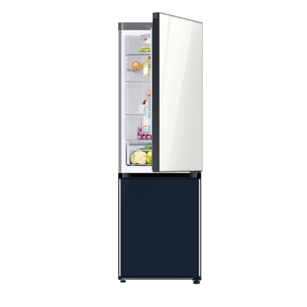 The Samsung RB33T307029 BESPOKE Bottom Mount Freezer Refrigerator is a premium appliance designed for modern kitchens. With a 339L net capacity, this refrigerator offers ample storage for families while maintaining a sleek, customizable BESPOKE design in Glam White and Navy Glass finish.