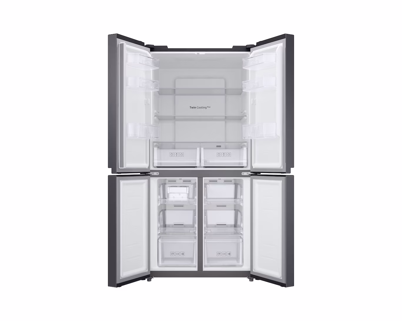 The Samsung RF48A4000B4 French Door Refrigerator is a premium appliance designed for large households and modern kitchens. With a 511L gross capacity, this refrigerator offers ample space for fresh and frozen foods. Its Twin Cooling Plus™ technology ensures independent cooling for the fridge and freezer compartments, maintaining optimal humidity and preventing odor mixing.