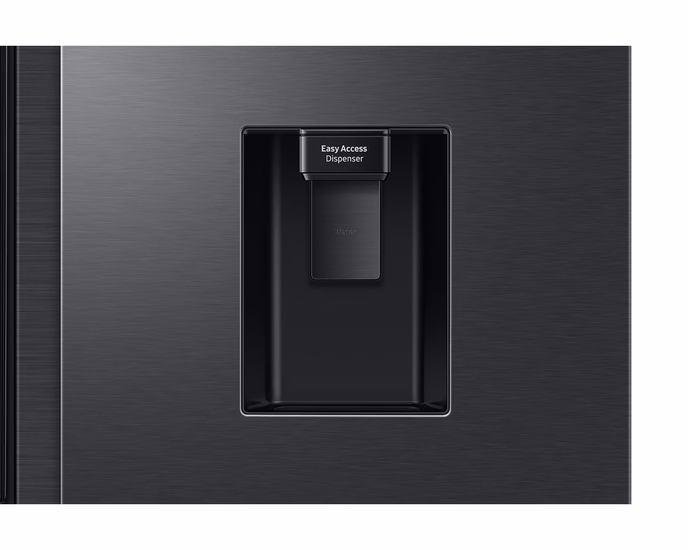 Additional highlights include a non-plumbed water dispenser, tempered glass shelves, LED lighting, door alarm, and a stylish Matte Black finish that complements any kitchen décor.