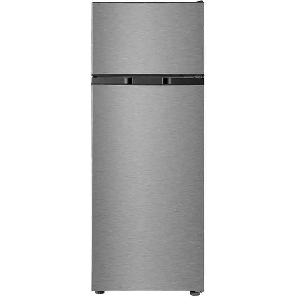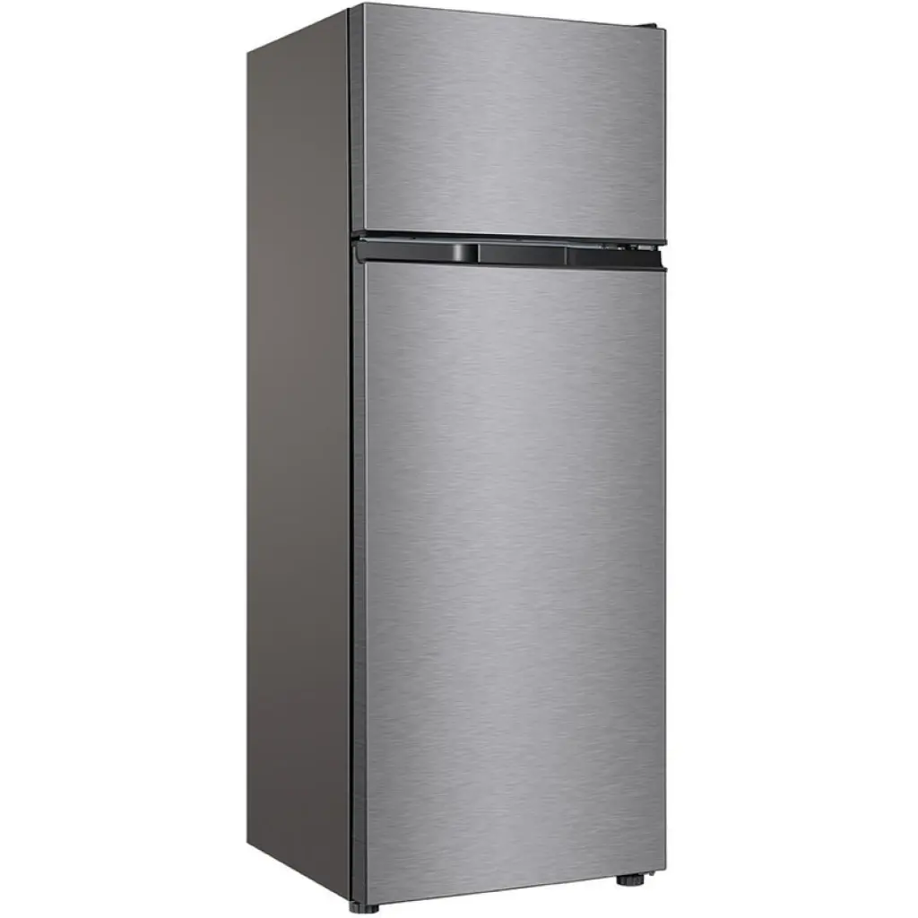 The TCL F270TM features a sleek metallic finish and a double-door top-mounted design, offering convenient access to both freezer and fridge compartments. Its compact yet spacious design fits seamlessly into modern kitchens, while adjustable feet ensure stability on any surface.